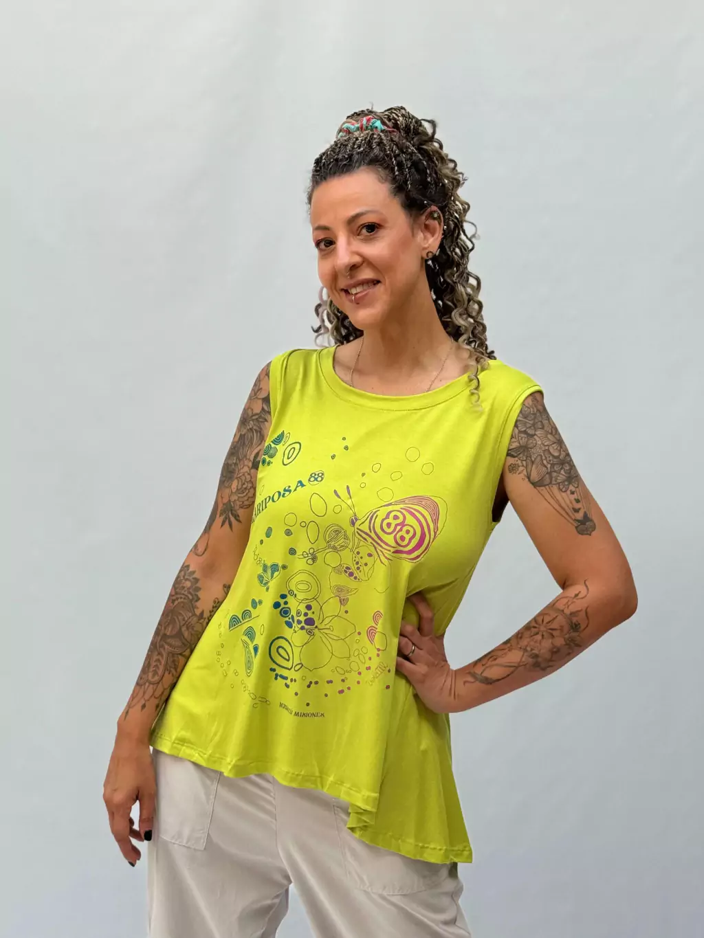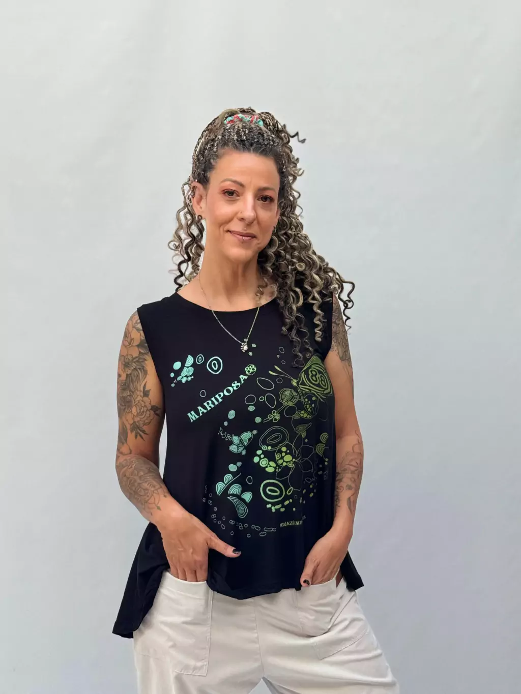 La musculosa Cocó, es una remera de corte evasé, más larga en la zona de la espalda que en el delantero. Este largo en su espalda puede disimular la parte trasera de tu cuerpo, tiene un vuelo y una caída que la hace ser la favorita a la hora de combinarla con un pantalón chupín o una calza.
