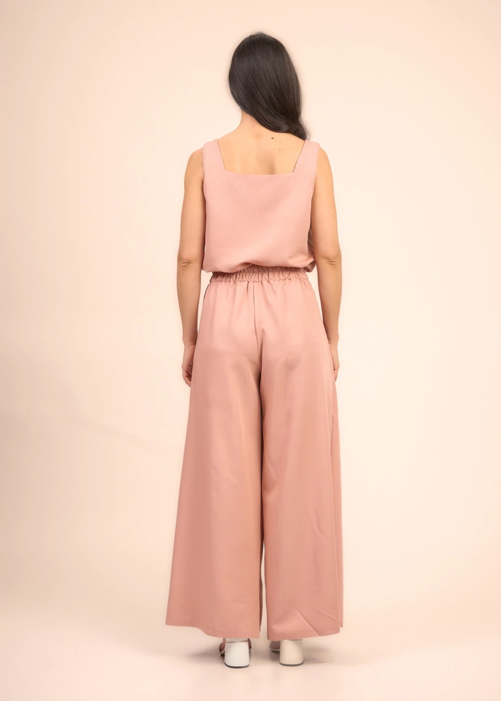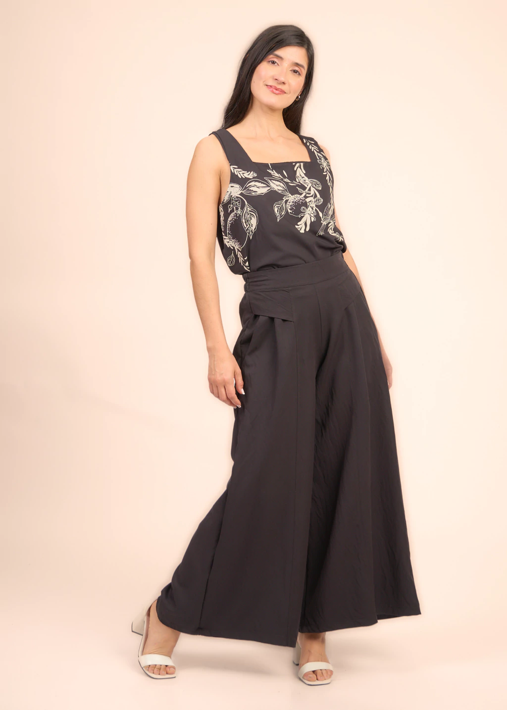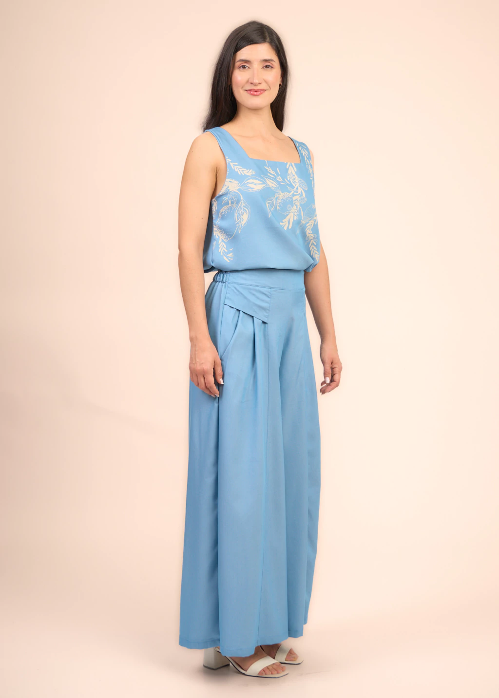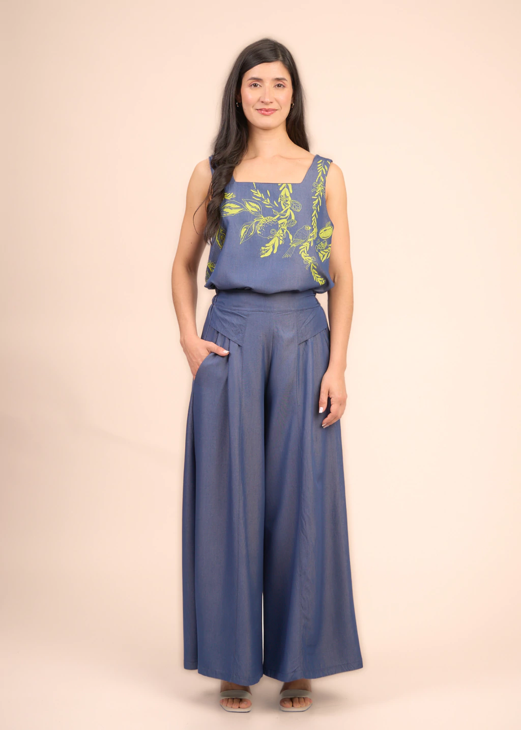 Descripción: Pantalón palazzo de calce amplio y fluido, con bolsillos laterales y detalle de pliegues en la pierna que lo hacen único. Con cintura plana en el frente y elástico en la espalda para mayor comodidad. Confeccionado en denim con spandex, combina diseño y versatilidad en una prenda que vas a usar siempre.