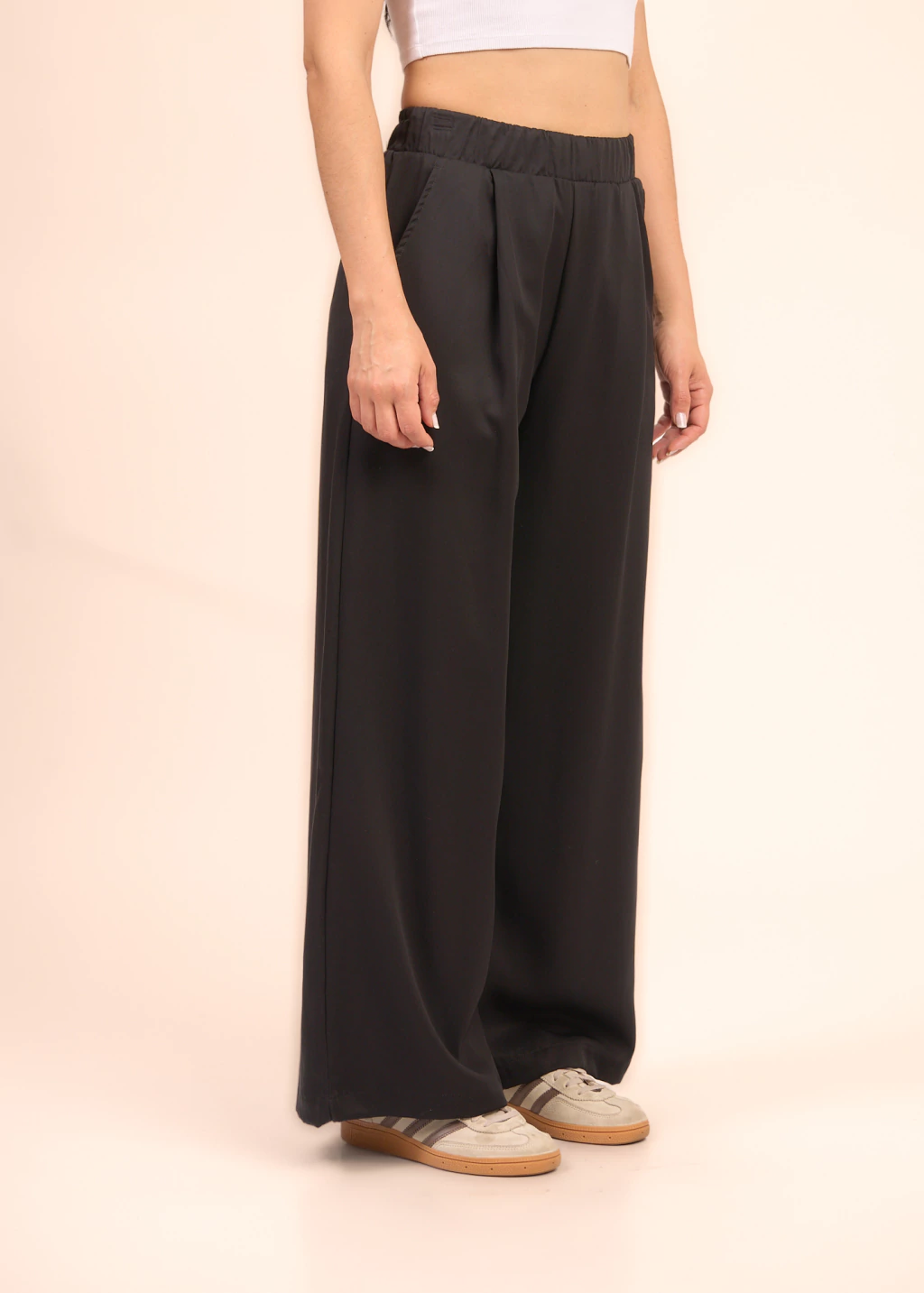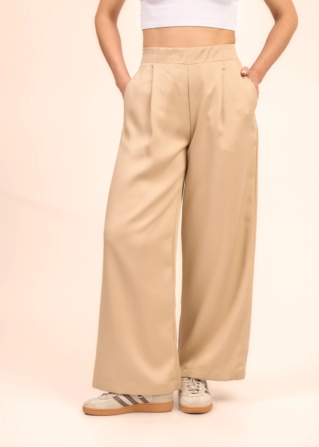 Descripción: Pantalón palazzo sastrero con pinzas delanteras y tiro alto, que estiliza y alarga la figura. Su diseño de piernas amplias lo convierte en una prenda elegante y juvenil. La cintura ceñida con elástico en la espalda brinda comodidad sin perder prolijidad en el frente. Con bolsillos laterales prácticos, es un básico versátil para usar de día o de noche.