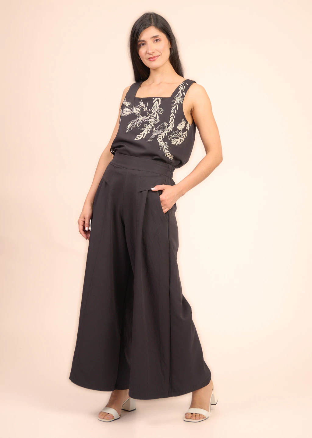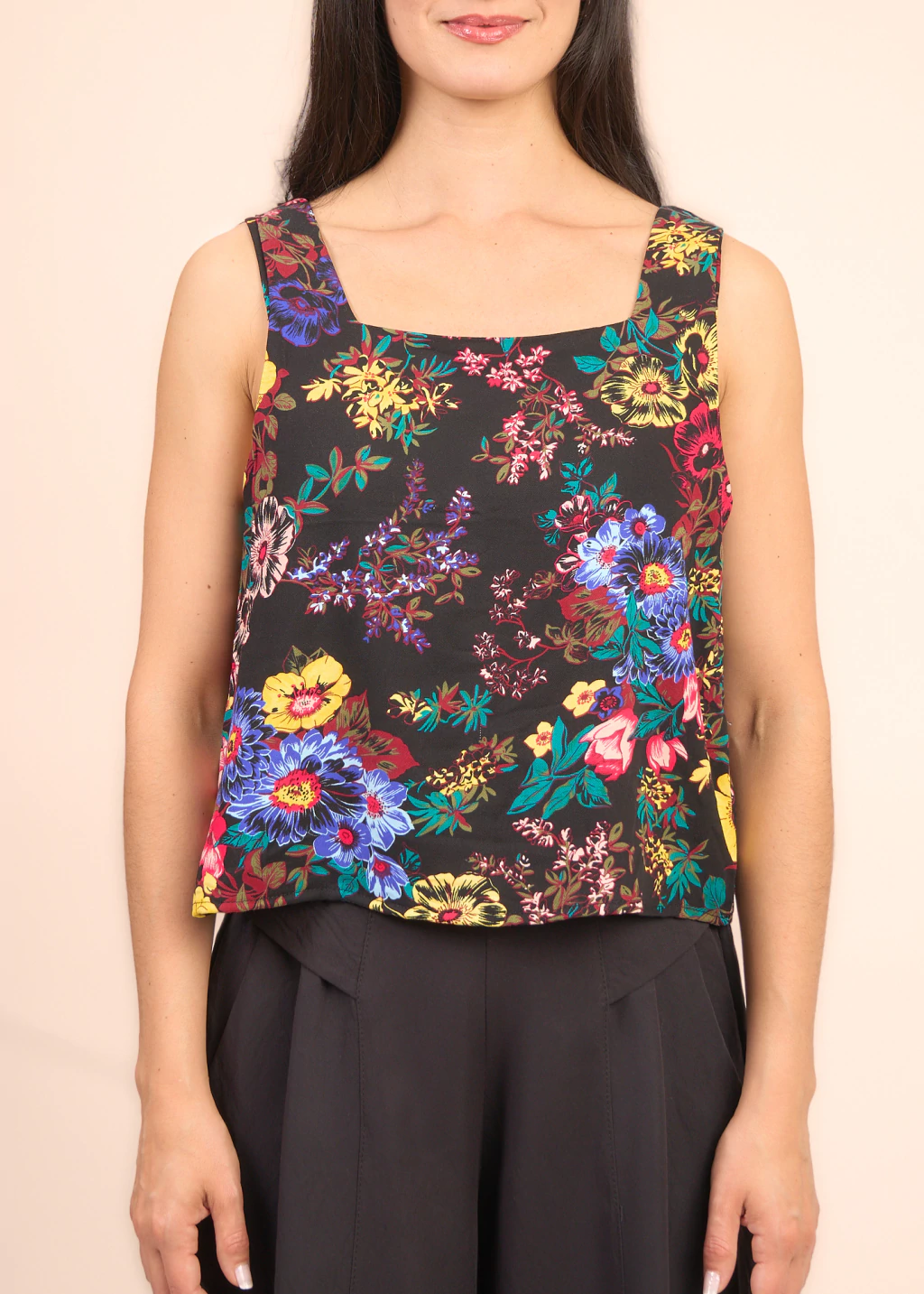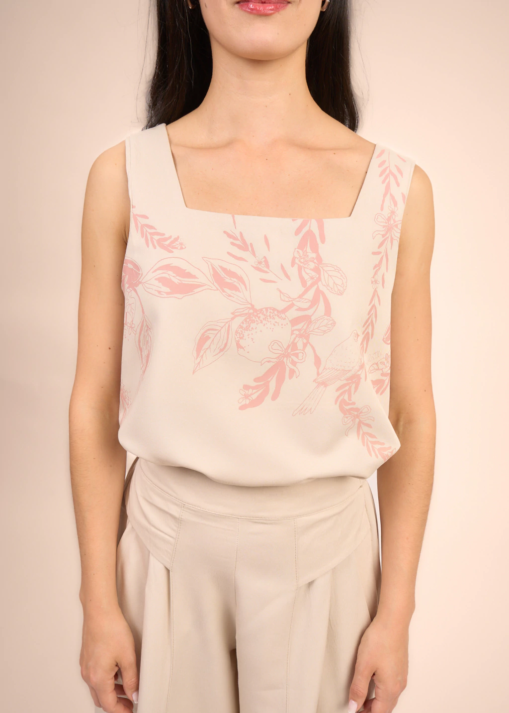 Descripción: Top de twill sastrero con cuello cuadrado, corte a la cintura y bretel ancho. Estampado en serigrafía con ilustración exclusiva de Volátil, inspirada en ramas, limones, flores y aves. Una prenda fresca y versátil, ideal para looks de verano y para combinar con pantalones de tiro alto o faldas.