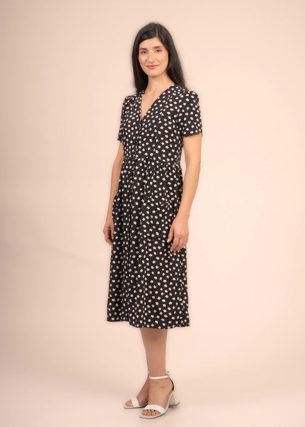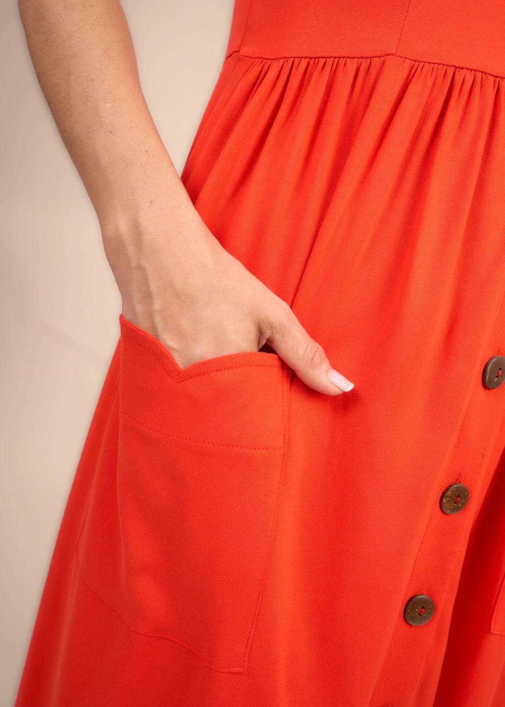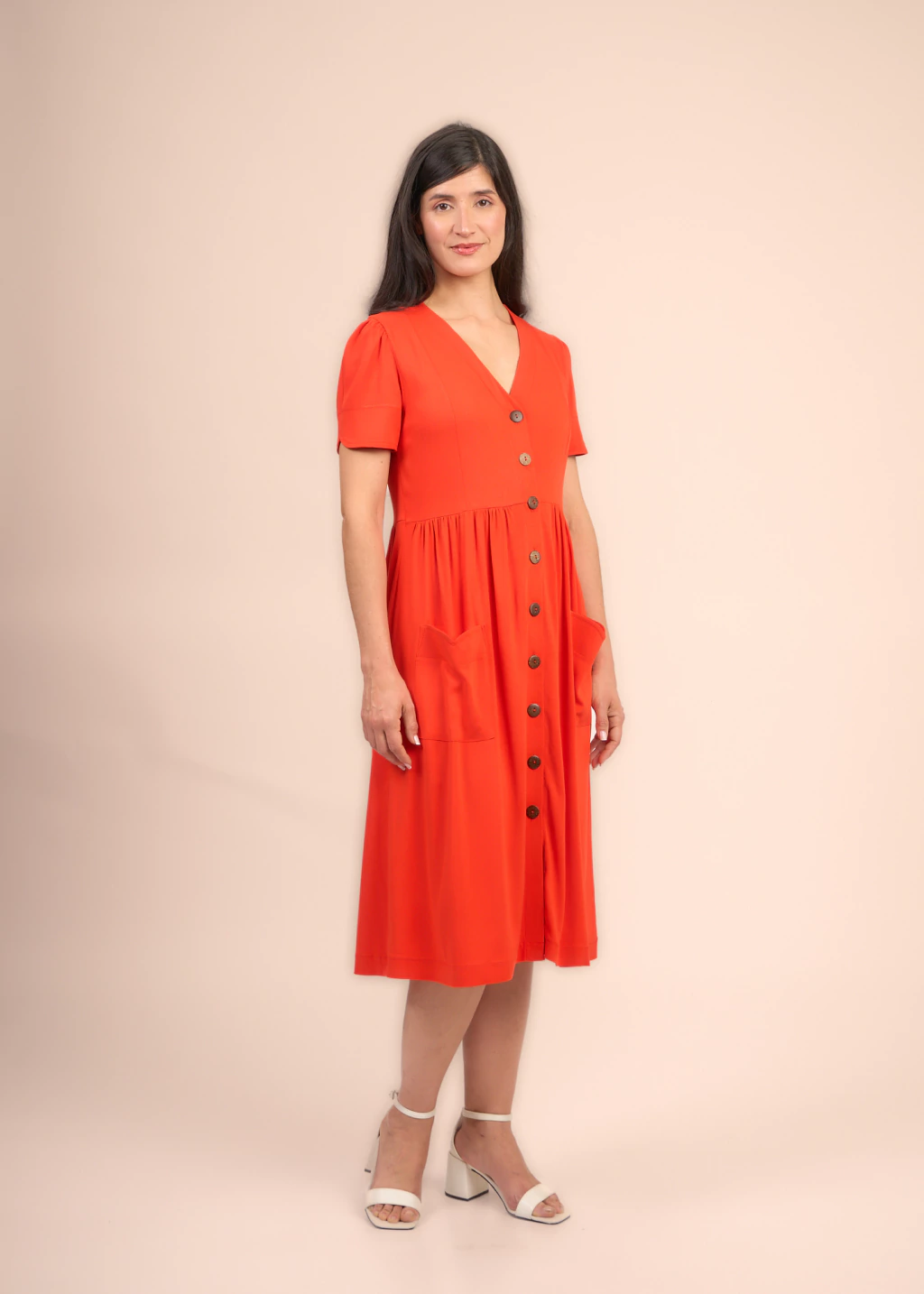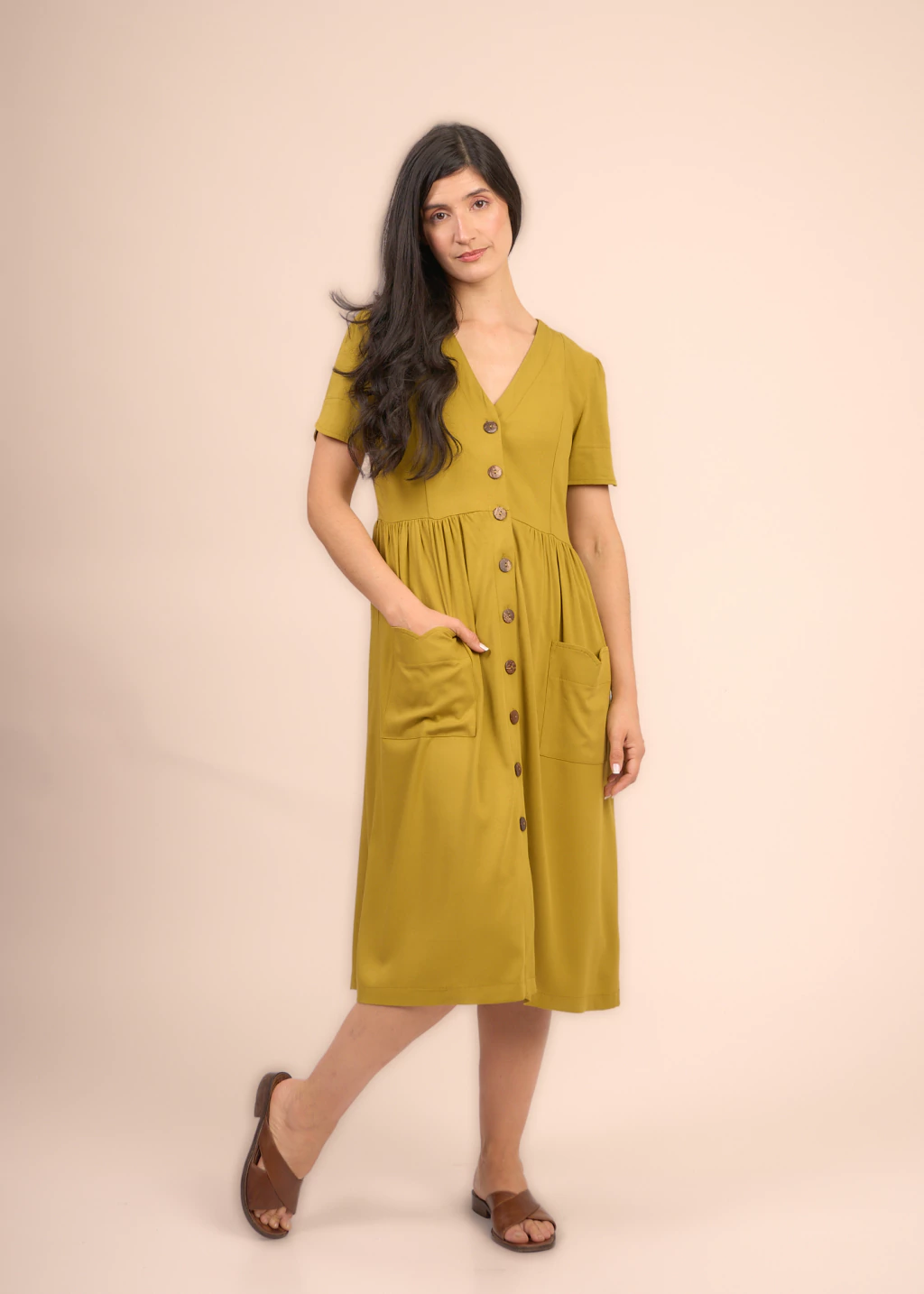 Descripción: Vestido con escote en V, falda amplia fruncida adelante y atrás, bolsillos y cartera de botones (de coco o acrílico según el modelo). Su diseño cómodo y elegante lo hace ideal para usar tanto de día como de noche.